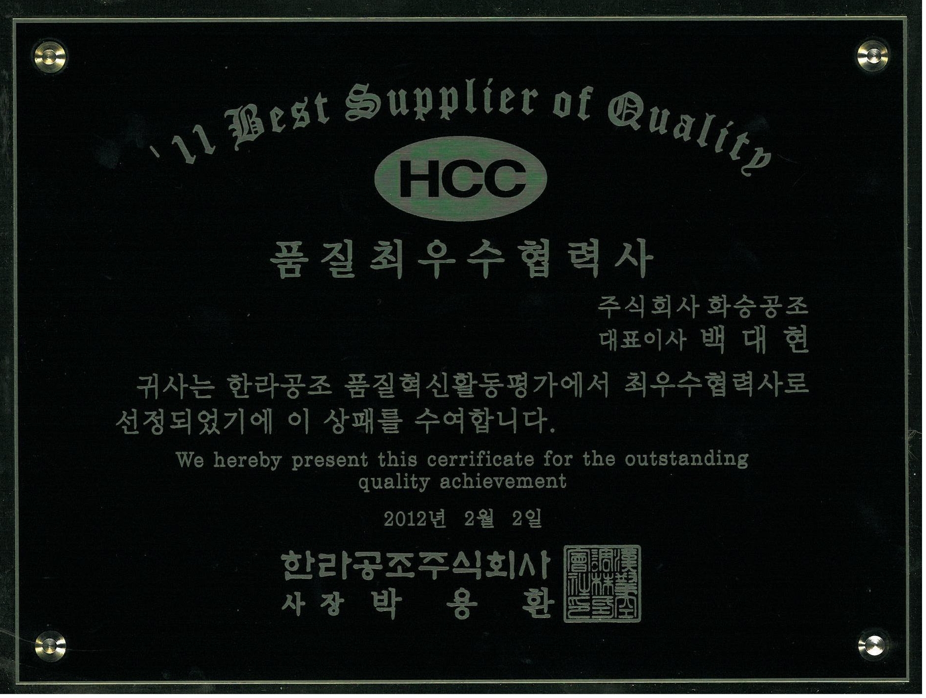 지난 2월 2일 화승공조는 최대 협력업체의 하나인 한라공조로부터 품질 최우수업체로 선정되었다. 최우수업체 선정은 한라공조가 작년 2011년 한해 동안 품질혁신활동평가를 실시한 후, 최고의 평가를 받은 업체에게 주는 것으로써 그 부문에 화승공조가 당당히 이름을 올렸다. 이를 계기로 화승공조는 국내 자동차 A/C 호스파이프 최고의 품질모범업체로 성장하는 계기를 마련하였다.