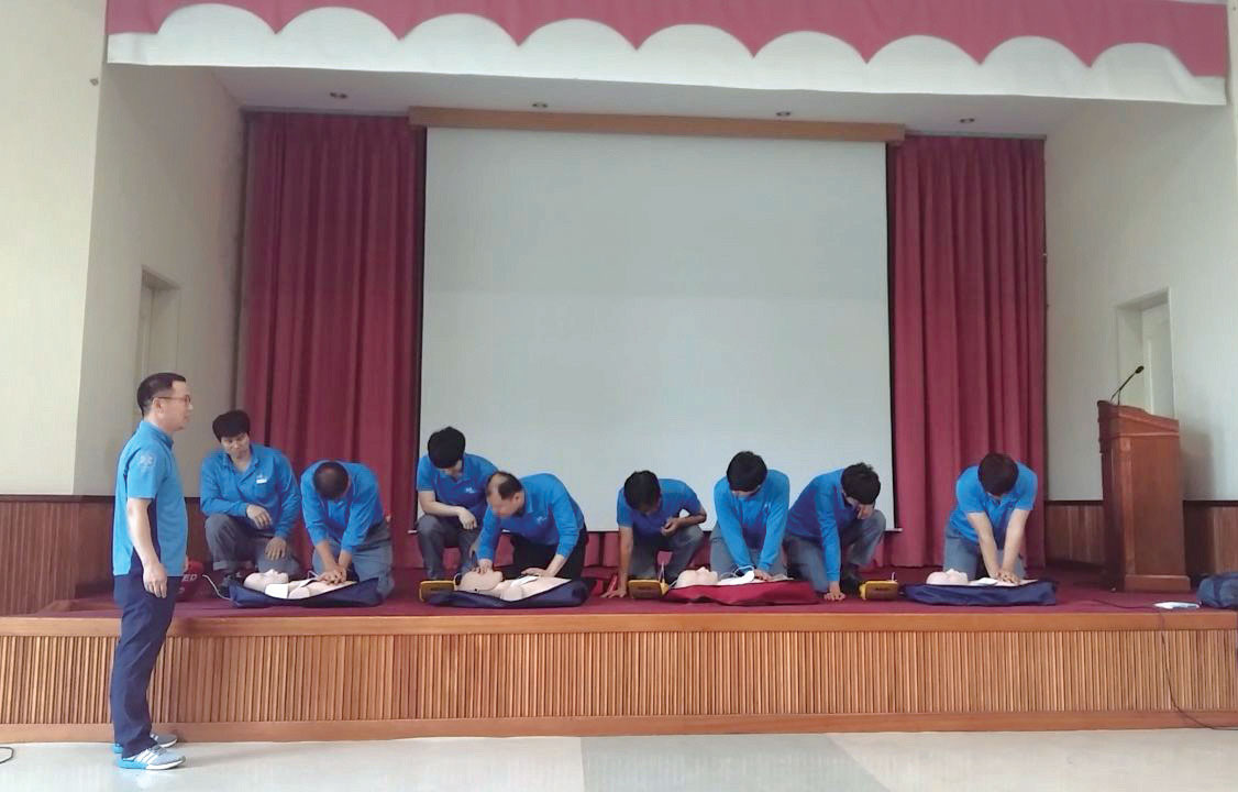 지난 7월 28일 화승인더스트리 아산공장 대강당에서 각 부서의 관리직직원과 현장 조/반장들을 대상으로 심폐소생술과 제세동기(AED) 사용방법에 대한 교육이 이루어졌다. 화승인더스트리는 교육일을 기점으로OPP팀, 통기성팀, PET팀, 총무팀 주 출입구에 제세동기(AED)를 설치함으로써 혹시나 발생할지 모를 위급사항에 대처하고 있다. 다가오는 9월에는 전 직원 대상으로 정기 안전보건교육 시 제세동기 사용 방법 및심폐소생술 교육을 실시할 예정이다.