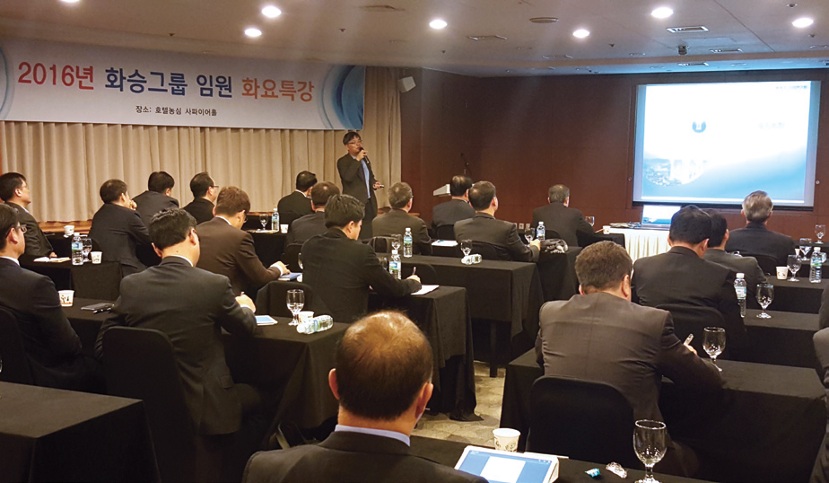 지난 2월 16일 부산 농심호텔에서 화승그룹 임원들을 대상으로 2016년 화승그룹 임원 화요특강 1회차 강연이 열렸다.‘세계 자동차산업의 변화 양상과 시사점’을 주제로 진행된 이번 강연은 자동차산업연구원 조철 실장이 함께했다. 조 실장은 감성품질의 구현, 친환경 이미지 부각 등을 강조하며 대한민국 자동차 산업의 생존방향을 제시하는 등 현실을 반영한 수준 높은 강의를 펼치며 특히 화승그룹 자동차부품사업군 담당 임원들의 큰 관심을 끌었다. 2015년부터 실시된 화승그룹 임원 화요특강은 연중 6회에 걸쳐 각계각층의 주요 강사들의 초빙 강연으로 진행되고 있다.