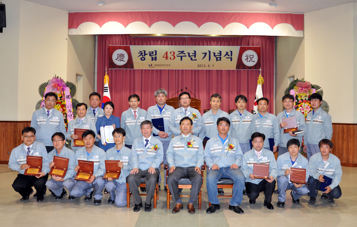 지난 5월 7일 화승인더스트리 창립 43주년 기념식이 아산공장대강당에서 열렸다. 이날 행사에서는 모범사원표창, 장기근속자표창, 우수제안부서 및 우수제안사원 시상식이 진행되었으며 팀MBO평가 우수부서도 시상을 하였다. 영업1팀의 김준봉 과장이 회장표창을 수상을 하게 되었다.