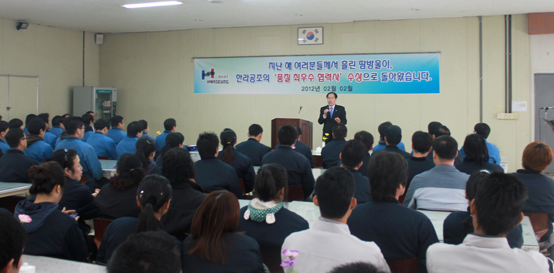 화승공조는 지난 3월 20일 사내 교육장에서 화승공조 백대현 대표이사의 주관 아래 품질최우수 협력사 수상 기념식을 가졌다. 이날 행사에서는 화승공조 전직원 및 사내 협력업체 직원들이 참석하였으며 품질 최우수 협력사 수상에 따른 공헌을 대해 감사패 및 포상금을 전달하였다. 화승공조의 품질 최우수 협력사는 '(주)일지'로 선정 되었다.