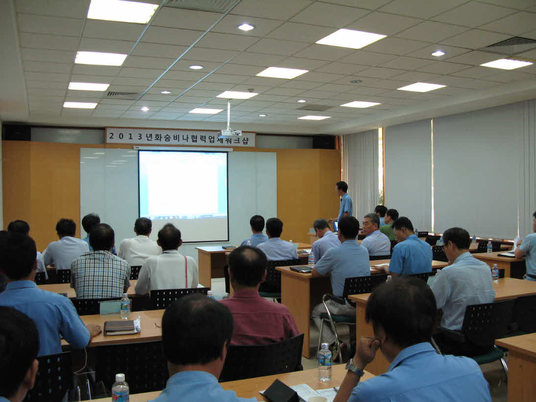 화승비나는 지난 1월 5일 사내 Sunflower Room에서 주요 협력업체 워크샵을 실시했다. 항도 비나, 모아비나, 코틴, 포스핀 등 총 10곳의 협력 업체가 참석한 이번 워크샵에서는 2013년 화승비나의 비전과 미션을 발표하며 2013년 화승비나의 새로운 출발의 신호탄을 쏘아 올렸다. 또한 이번 미팅에 참석한 협력 업체는 지난해 실적과 함께 올해 혁신 계획발표를 하는 등 관계사 모두가 한해 목표와 비전을 공유하는 등의 소중한 시간을 보냈다.