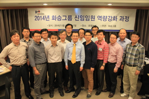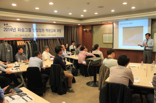 지난 5월 15일부터 17일까지 2박 3일간 부산 농심호텔에서 <2014년 화승그룹 신임임원 역량강화 과정>이 열렸다. 2014년 새롭게 승진한 국내?외 신임이사 15명을 대상으로 열린 이번 과정은 경영지식과 실용지식 습득을 통한 경영 인사이트 함양을 목표로 구성됐다. 교육 프로그램으로는 리더십, 변화관리, 전략, 비전, HR까지 총 5가지 분야의 비즈니스 매니지먼트 스킬을 전문 강사진의 강연과 함께 사례연구, 실습 등의 방식으로 진행됐다. 특히 신임임원들은 회사 내 인재육성과 관련된 ‘인재 경영’ 교육에서 높은 만족도를 보였다. 과정이 종료된 후, 이들은 화승그룹의 지속적인 발전을 위해 화승만의 명확한 가치설정과 이에 대한 올바른 방향제시를 통해 훌륭한 인재육성을 하겠다며 새로운 관리자로서 앞으로의 포부를 다짐했다.